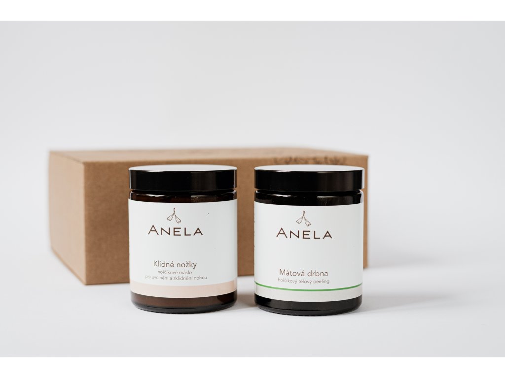 Obsah | Papírová dárková krabička, kartička s věnováním a návodem k použití, Klidné nožky 180 ml, Mátová drbna 180 ml. |