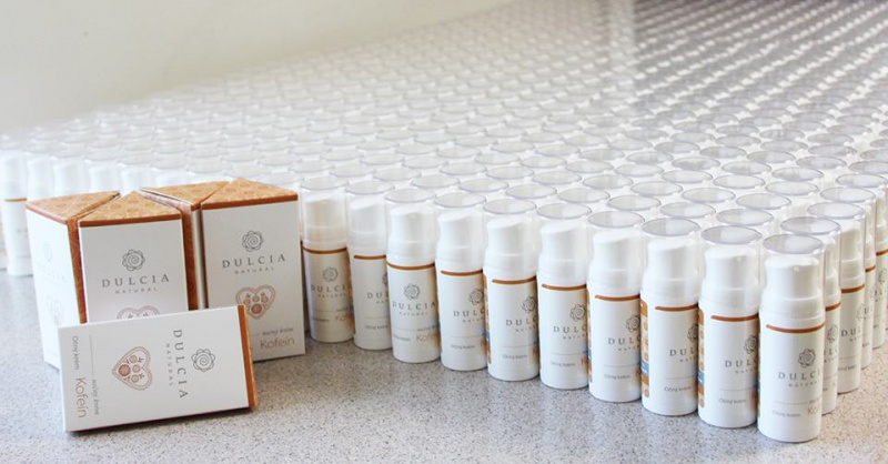 Dulcia balí své výrobky do bílých pumpičkových obalů z recyklovaného plastu. Díky nim se ke kosmetice nedostane vzduch a je perfektně chráněna před mikroby. A nejen to! Jelikož obsah nenabíráte prsty a nemůžete jej kontaminovat, nemusí Dulcia používat nebezpečné konzervanty. Své produkty stabilizuje vlastnoručně vyrobeným konzervantem z rostlinných surovin, nebo silnými antioxidanty - extraktem z grepových jader, rozmarýnem, meduňkou, levandulí, nebo oreganem.